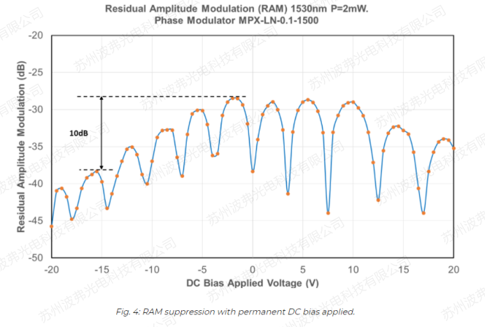 iXblue为PDH设计并优化了专用于减小RAM的低频相位调制器。RAM可以通过在调制器注入一个直流电压而降低,该电压对应于铌酸锂波导一个整体的负折射率变化。一个5-15V直流电压足以将RAM降低>10dB。