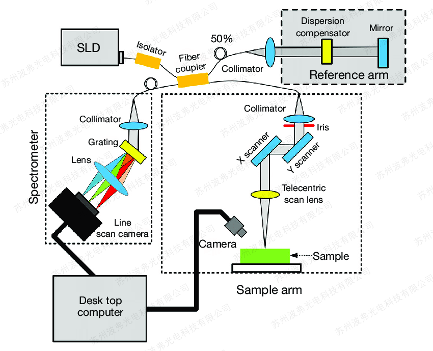 如下图,常用的SD-OCT系统,基于超辐射发光二极管宽带光源(SLD光源),光学器件(隔离器,耦合器,准直器,反射镜,光栅),扫描振镜(一维、二维扫描振镜),高速扫描相机(线阵相机、面阵相机),OCT光谱仪,图像采集卡,数据处理系统等组成。
