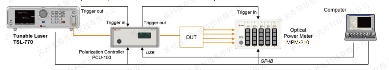IL/PDL measurement setup with the polarization controller PCU-100 and the power meter MPM-210 |